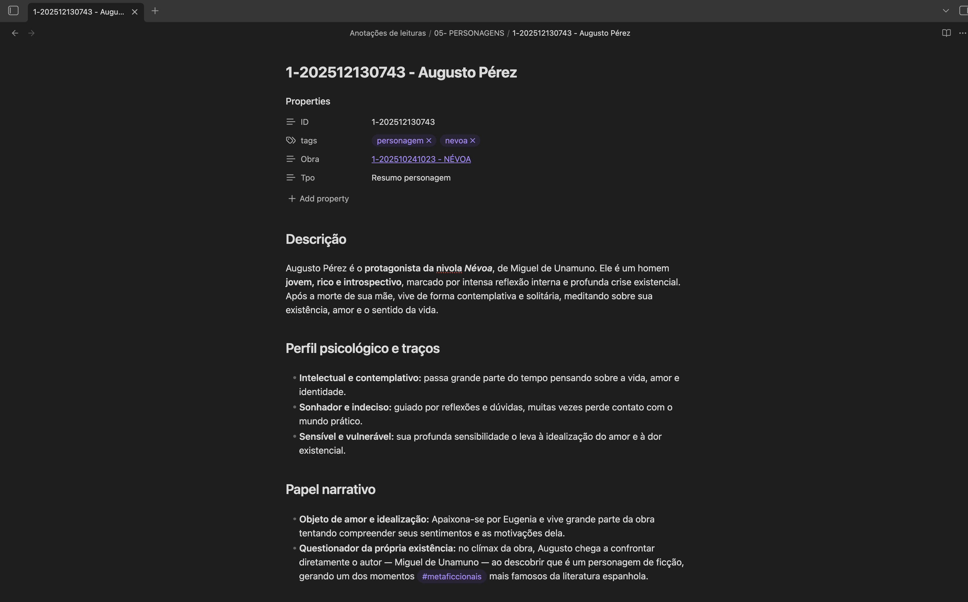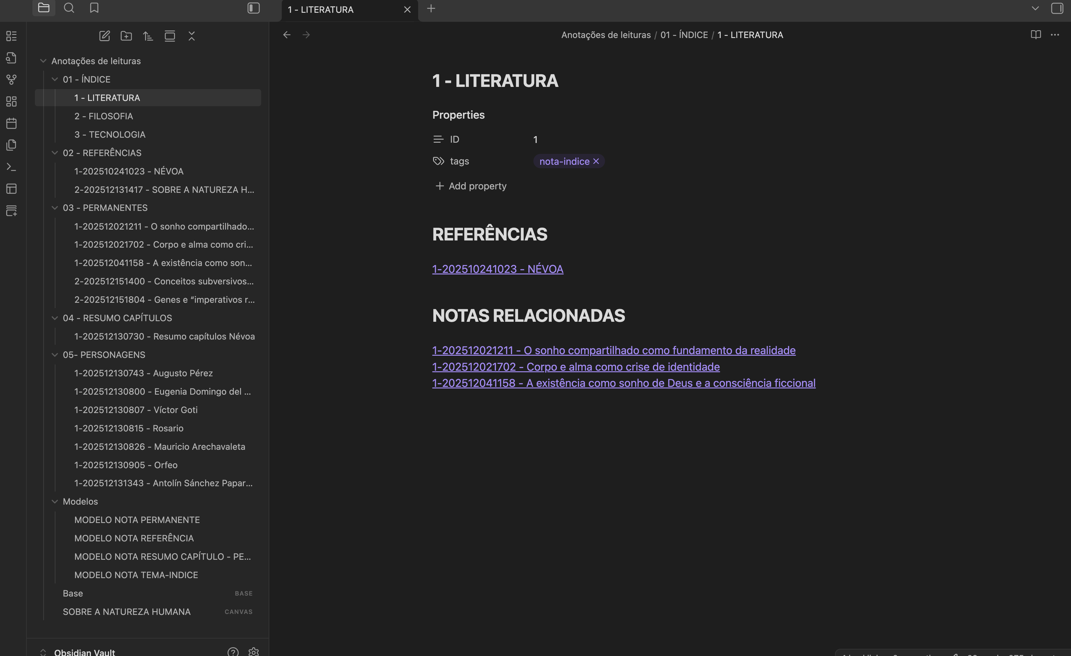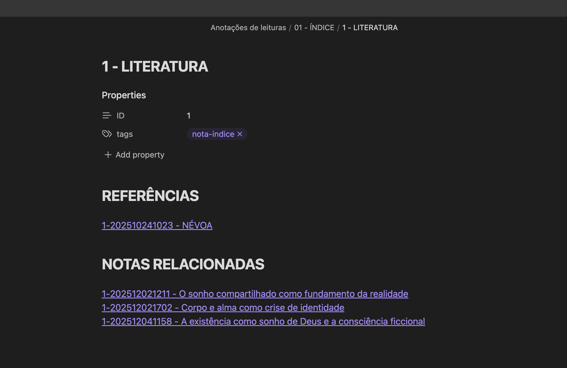 - Tema: Aqui você cria um link arrastando a Nota de Índice correspondente (ex: Nota índice de Literatura) para dentro desse campo, conectando a obra ao seu tema geral.