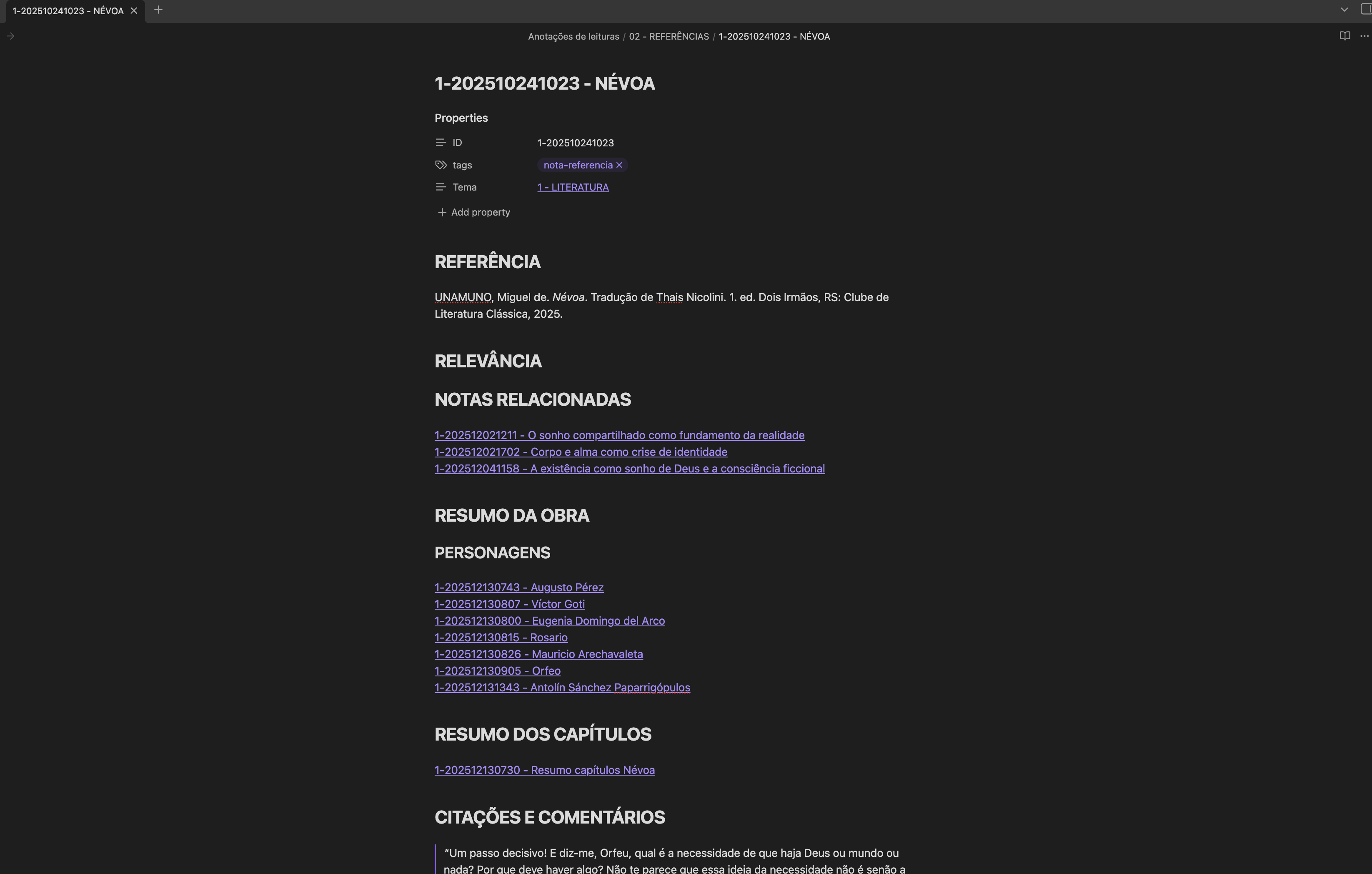 Criação e Título: Ao criar uma nova nota na pasta de referências, o título deve seguir o padrão de ID numérico seguido do nome da obra.