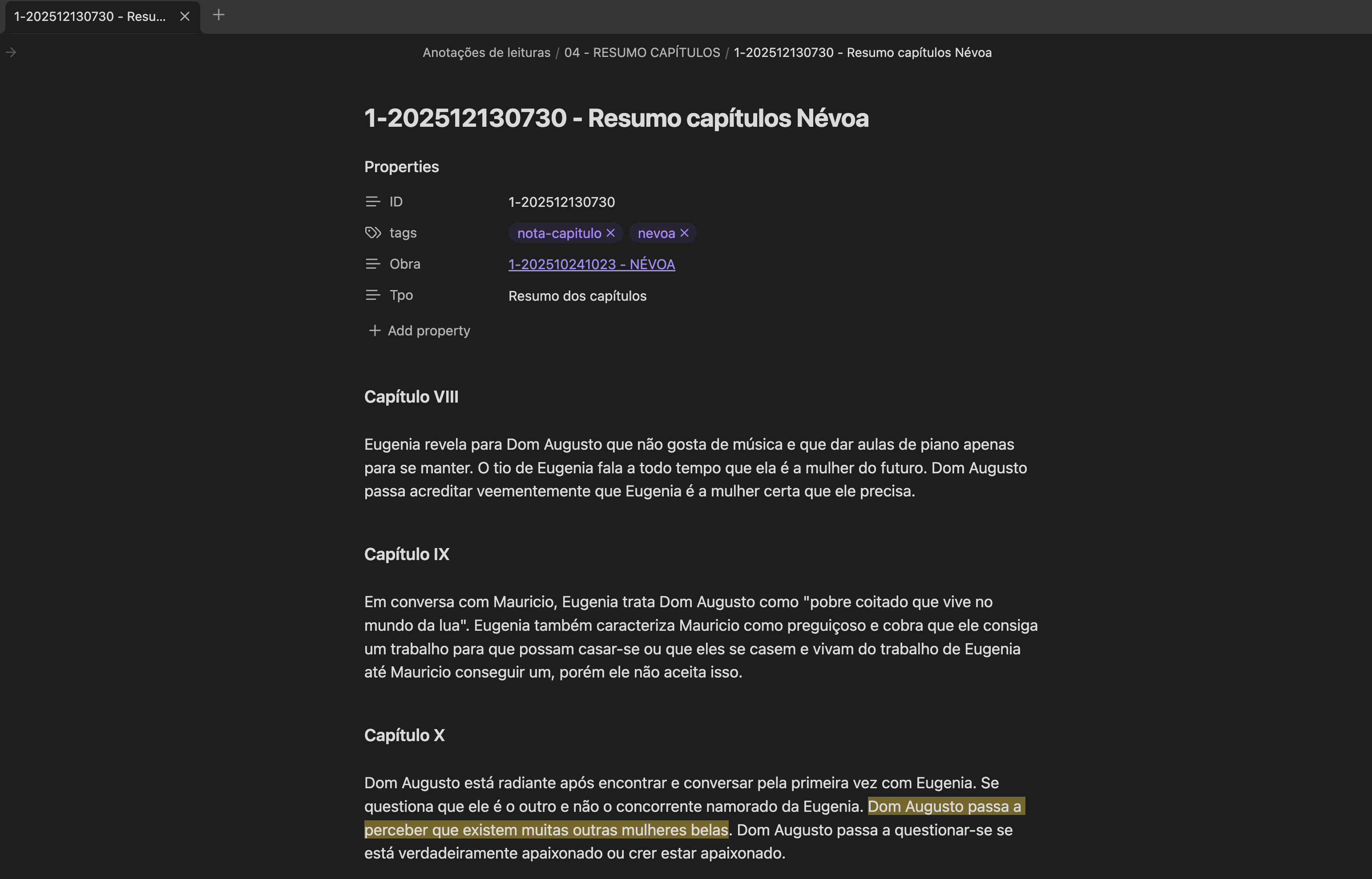 A nota de resumo de capítulo é uma nota de leitura, criada para registrar o que acontece em um capítulo específico de uma obra. Seu objetivo é capturar o conteúdo narrativo essencial, preservando o contexto da leitura sem sobrecarregar a nota de referência ou misturar resumo com interpretação.